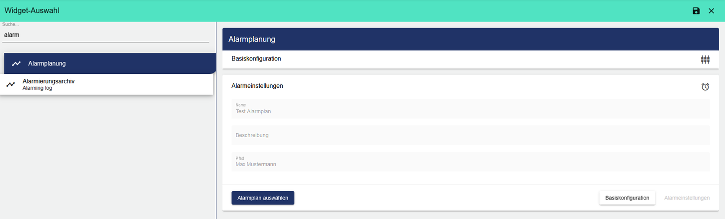 “Alarmplanung” und andere Widgets in das Dashboard einfügen (Siehe Alarmplan )