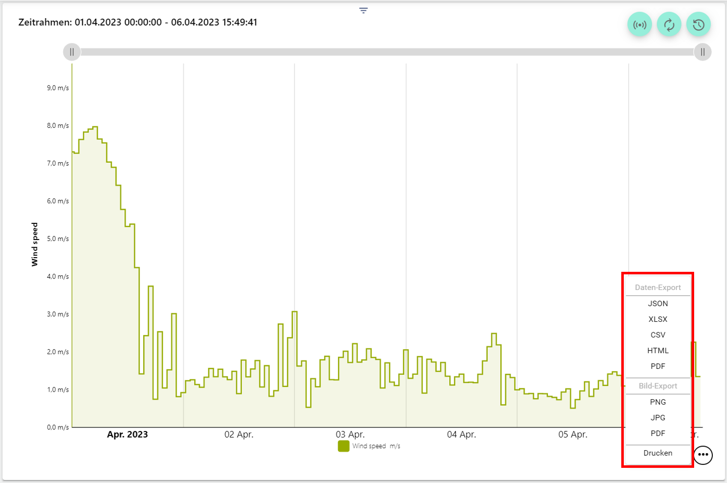 12.) Die Zentrale Zeitsteuerung wurde überarbeitet und optimiert. Nun lässt sich mit dem bekannten “Zeitmanagement” ein Kanal auswählen, um alle gewünschten Widgets: Analysis zu steuern. Im unteren Beispiel wurde mit einem Klick die Zeitspanne aller Widgets gesetzt. Somit kann der Zeitbereich vom 03.04. bis 05.04 einfach und schnell ausgewertet werden.