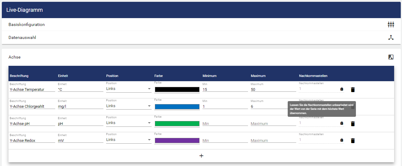 3) Im Widget: Gangliniendiagramm und im Widget: Live-Diagramm werden im Reiter Achse und Serie die Nachkommastellen aus dem zuvor konfigurierten Signal bei Achse und Serie automatisch aus der Konfiguration übernommen. Eine individuelle Änderung ist jedoch in der Konfiguration des Widgets möglich.