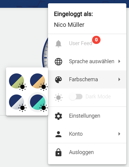 Dazu klicken Sie am oberen rechten Rand auf das Kopf Symbol und wählen den „Farbschema“ Menüeintrag aus. Dort können Sie zwischen einem Hellen oder Dunklen auswählen.