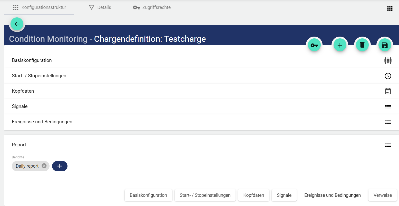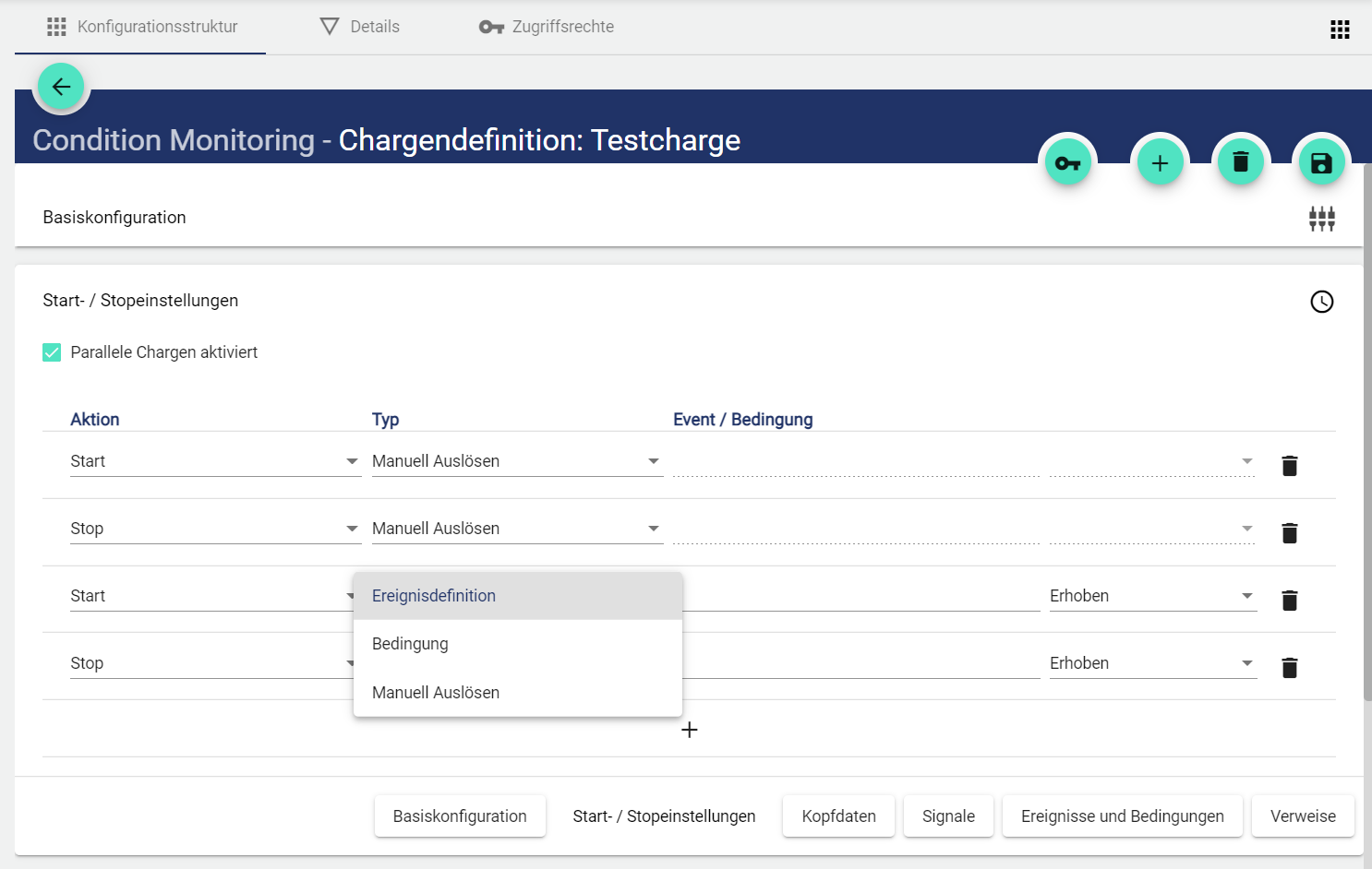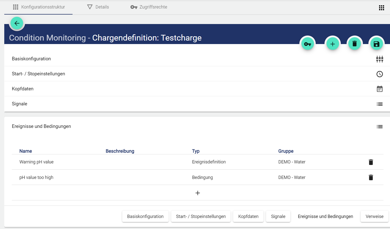 Alle hier hinzugefügten Ereignisse oder Bedingungen werden während dem Ablauf einer Charge, der Charge zugeordnet und können im Report angezeigt werden.
