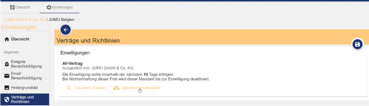 In der Administration des jeweiligen Mandanten unter Verträge und Richtlinien den JUMO Cloud AV unter Vertrag hinzufügen hochladen: