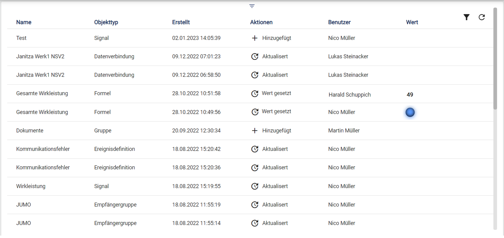 Das Widget Audit Logs zeigt die Veränderungen eines beliebigen Sollwert Signals an.