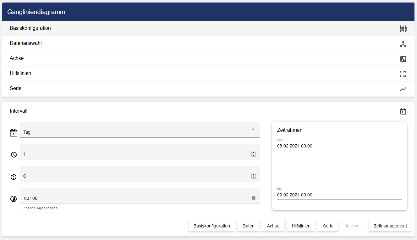 Nun können Sie das Intervall der anzuzeigenden Daten festlegen. Klicken Sie dafür auf den Reiter „Intervall“. Die kleinstmögliche Zeiteinheit ist hierbei 1 Tag.