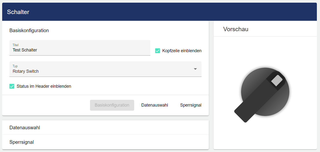 In der Basiskonfiguration des Schalters vergeben Sie einen geeigneten Titel. Durch die Auswahl des Hakens kann die Kopfzeile eingeblendet werden. Nun müssen Sie noch den Typ des Schalter auswählen, Sie haben hier die Wahl zwischen „Switch“ und "Rotary Switch".