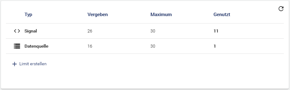 Limits dienen zum Begrenzen der Signale und Datenquellen innerhalb eines Mandanten. Ist ein Limit gespeichert, nimmt die Spalte Maximum die entsprechende Obergrenze an.