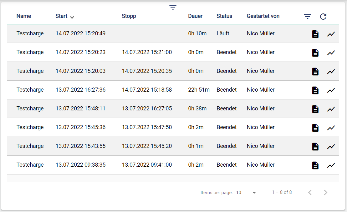 Im Chargenarchiv können alle abgeschlossenen und laufenden Chargen angezeigt und gefiltert werden. Ebenso können je Charge individuelle Reports, Signal-Kurvenverläufe und Kopfdaten eingesehen und ausgewertet werden.