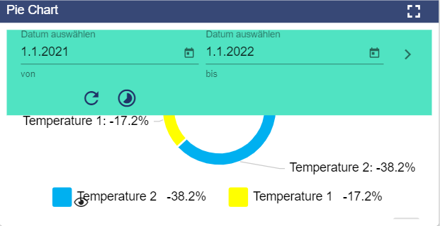 Per Klick auf den grünen Pfeil in der oberen linken Ecke öffnet sich ein neues Fenster. Dort kann direkt im Widget ein neuer Zeitraum für das Kreisdiagramm festgelegt werden, ohne in die Widget-Konfiguration zu müssen. Die Auswertung des Kreisdiagramms passt sich per Klick auf das Aktualisierungs-Icon an.
