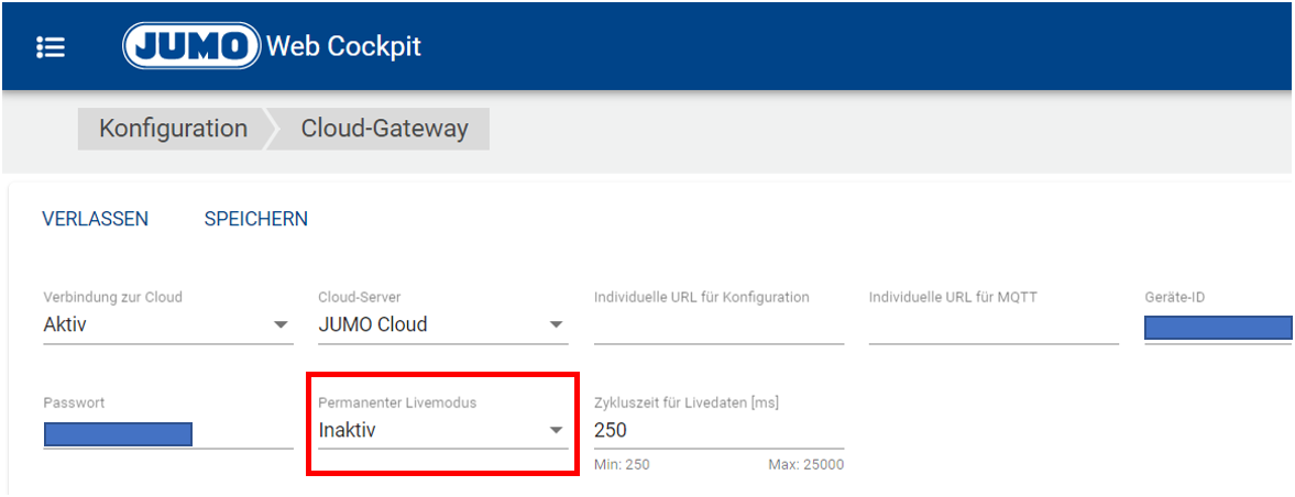 Wird im Web Cockpit des JUMO variTRON der “permanenter Live Modus” deaktiviert, werden keine Live-Daten gesendet. In diesem Zustand werden nur historische Daten nach Intervallzeit übermittelt.