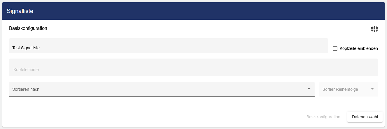 In der Basiskonfiguration der Signalliste vergeben Sie eine geeignete Beschriftung (Titel). Durch die Auswahl des Hakens kann die Kopfzeile eingeblendet werden.