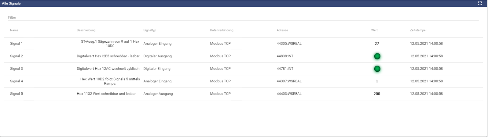 Das Widget Signalliste präsentiert die von Ihnen ausgewählten analogen und digitalen Signale inkl. Zeitstempel und weiteren konfigurierbaren Informationen in einer tabellarischen Ansicht.
