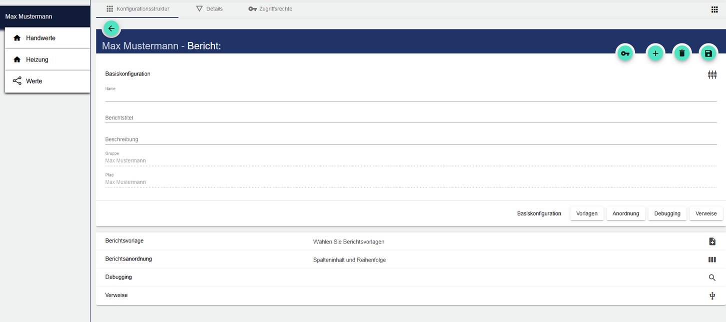Name des Berichts in der Basiskonfiguration vergeben. Das Feld Beschreibung ist optional nutzbar. Das Feld “Gruppe” zeigt, in welcher Gruppe dieser Bericht angelegt wurde. Der Pfad wird systemseitig automatisch generiert.
