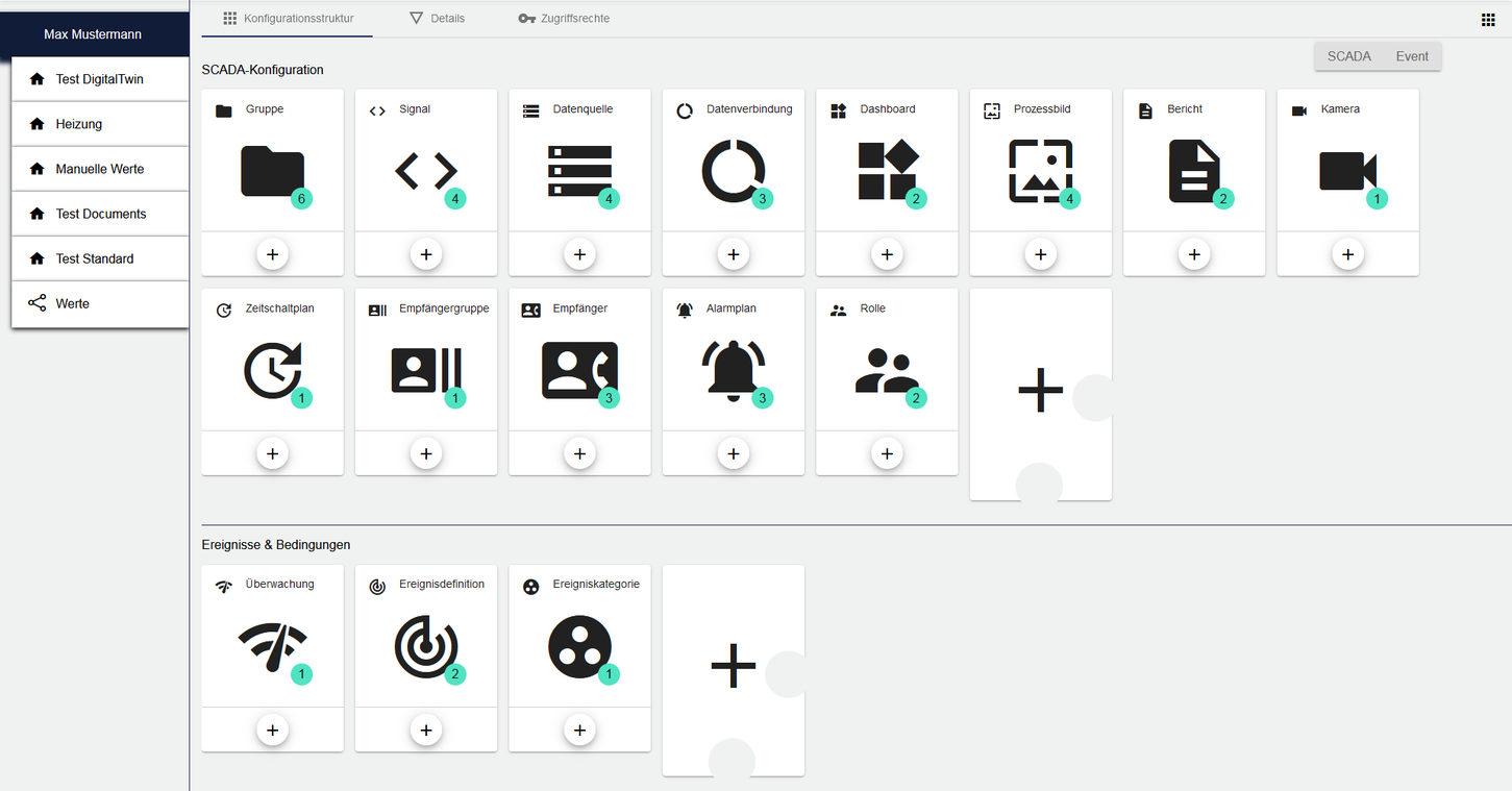 Auf der linken Seite (innerhalb der Sidebar) befinden sich die Gruppen. Jede Gruppe beinhaltet jeweils eine Konfigurationsstruktur, einen Details Bereich und eine Zugriffsrechte- Verwaltung. Eine Gruppe kann mehrere Widgets enthalten und dient der strukturierten Übersicht und visuellen Darstellung. Eine neue Gruppe wird über die Konfiguration des ausgewählten Mandanten erstellt.
