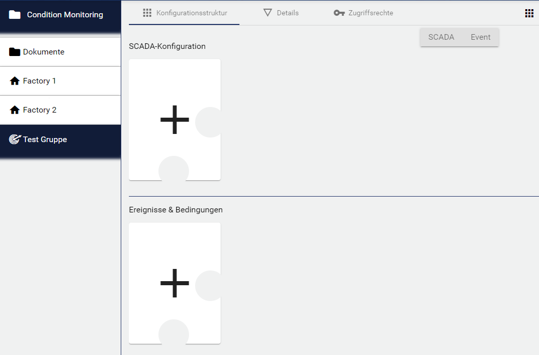 Eine Gruppe strukturiert den Mandanten. Die in der Konfiguration festgelegte Struktur gilt ebenso für Dashboards und Inbetriebnahme. Jede Gruppe beinhaltet alle Konfigurationselemente (Konfigurationsstruktur, Details, Zugriffsrechte)