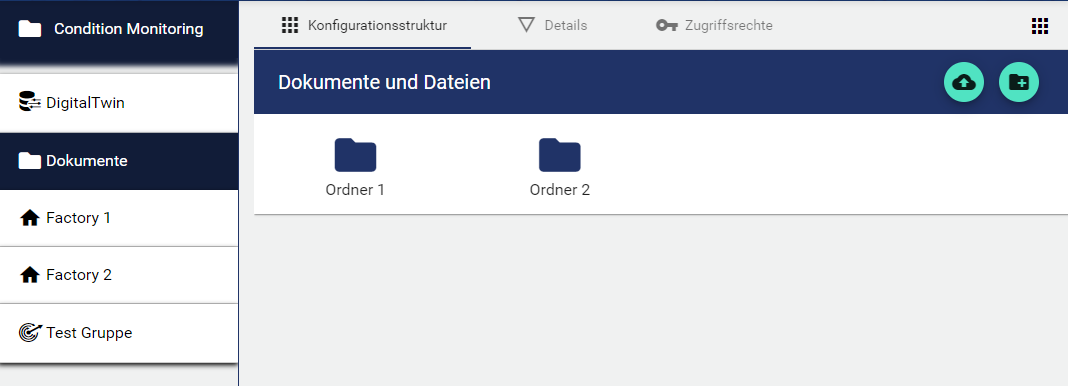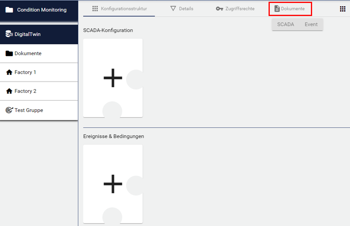 Über “DigitalTwin” wird eine Gruppe angelegt, die sowohl die Einstellungen von “Standard” als auch “Documents” kombiniert übernimmt. Die Gruppe wird über die Konfigurationsstruktur konfiguriert. Dokumente können über die Schaltfläche “Dokumente” hochgeladen werden.
