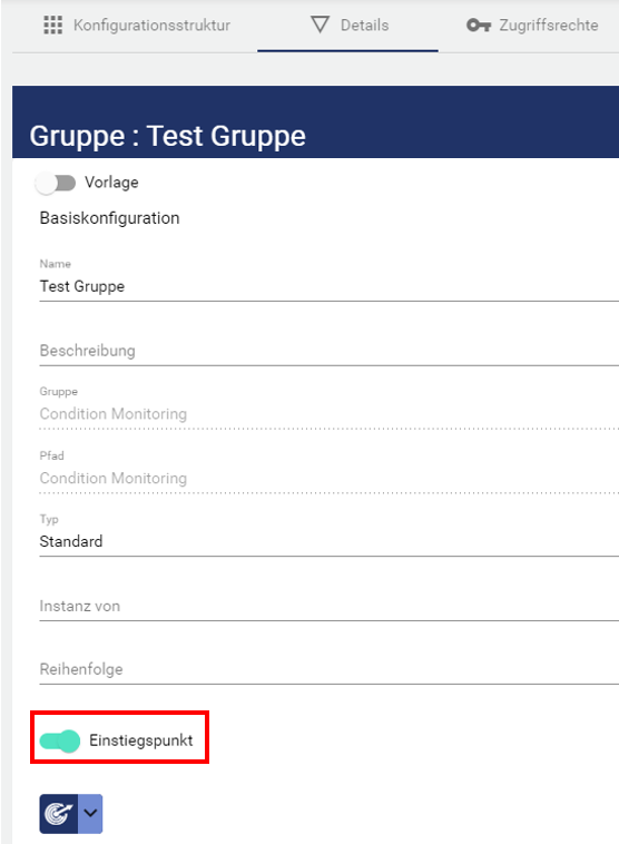 Aktiviert man “Einstiegspunkt”, enthält die Gruppe innerhalb der Konfigurationsstruktur die Kachel Dashboards. Ohne diese Aktivierung enthält die Gruppe keine Dashboard Konfigurationtskachel.