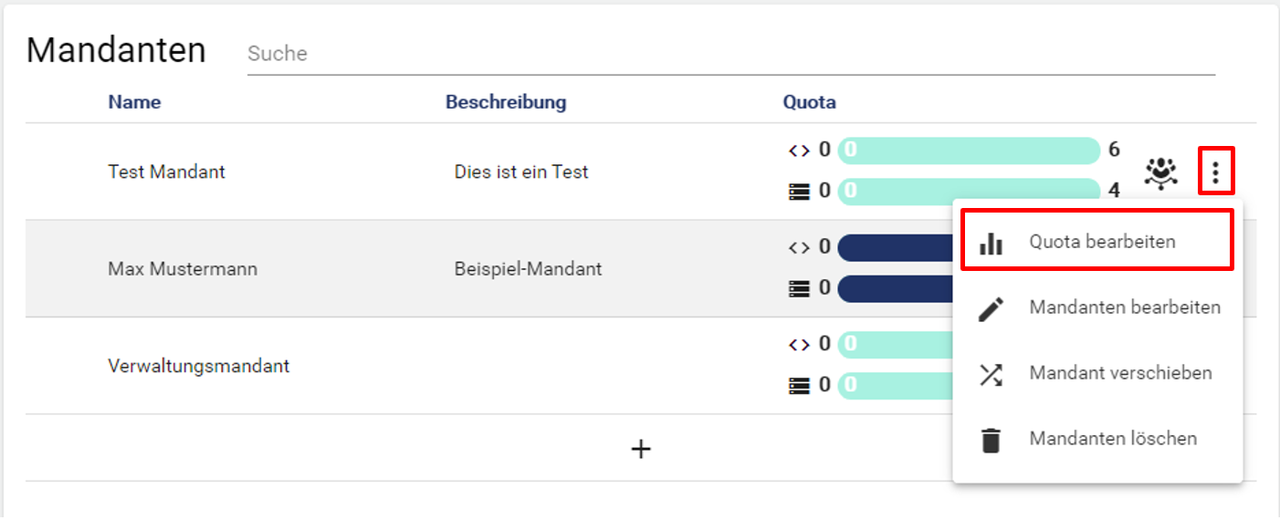 In diesem Bereich können die Maximum Quota für Untermandanten bearbeitet werden.