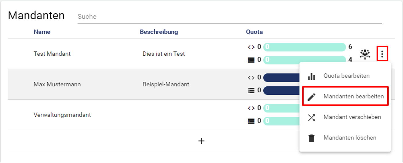 Über diesen Button öffnet sich die Administration der einzelnen Untermandanten. Die Konfigurationsmöglichkeiten sind sowohl bei einem Mandanten, als auch einem Untermandanten gleich.