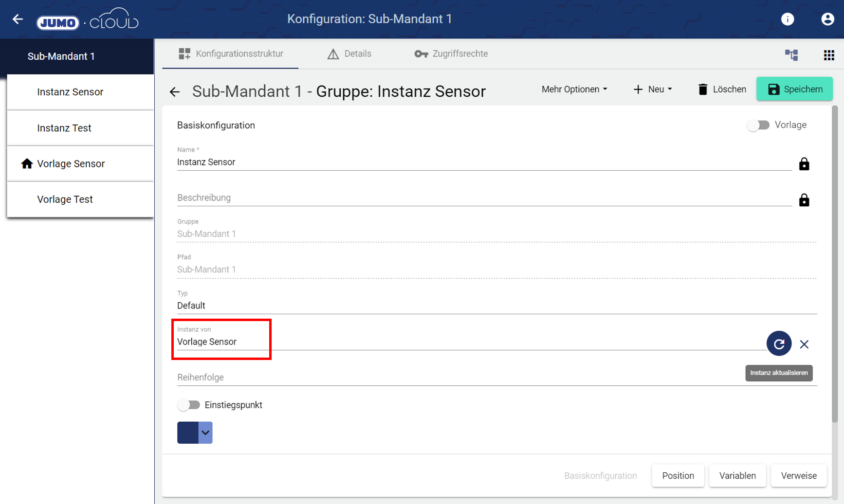 Soll aus einer Vorlage eine Instanz erstellt werden, so muss eine Gruppe als Instanz erstellt werden (Achtung: nicht unter einer Vorlage erstellen). Das “Instanz von” Feld taucht erst nach dem ersten “Speichern” auf. Anschließend kann die Instanz rechts aktualisiert werden, um die Konfigurationselemente aus der Vorlage zu laden bzw. zu aktualisieren.