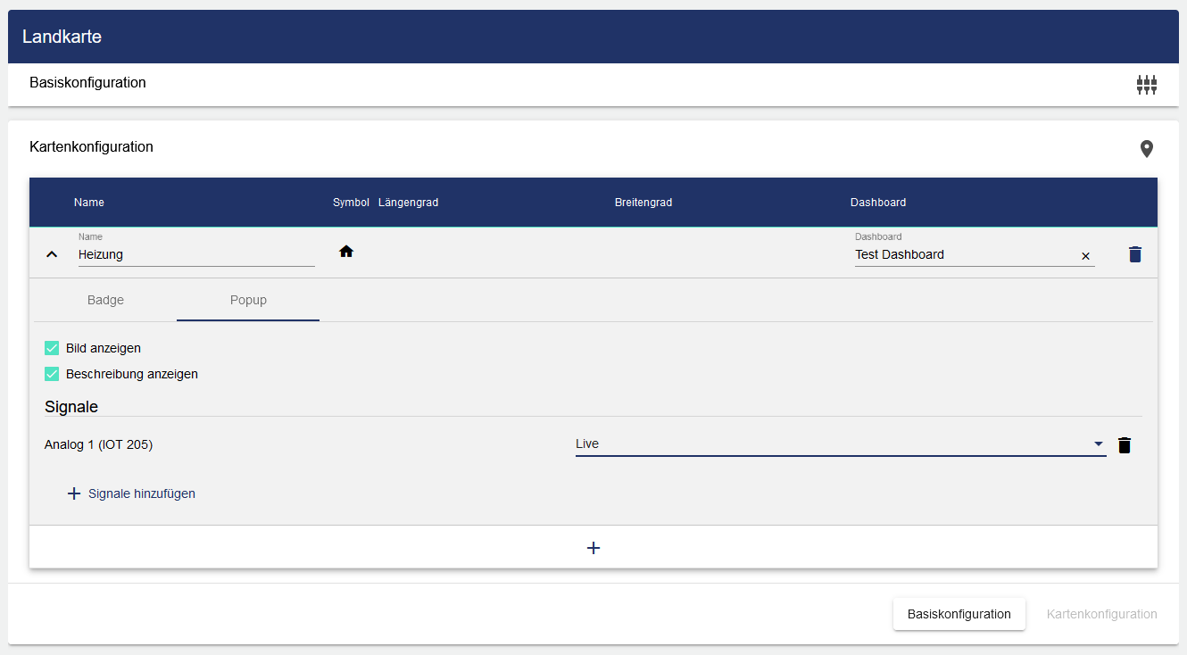 Unter dem Reiter „Popup“ können Sie Signale hinzufügen und ein individuelles Aufzeichnungsintervall wählen. Wenn der Marker als “Gruppe angelegt wurde kann zusätzlich bestimmt werden, ob das “Bild” und die “Beschreibung” mit angezeigt werden sollen.