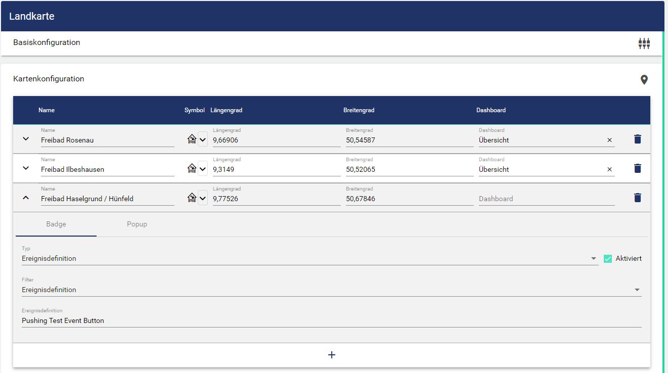 Unter “Badge” wird eingestellt, was auf dem Landmarker zu sehen ist. Hier können sowohl Signale, als auch eine Ereignisdefinition und Ereigniskategorie angewählt werden. Bei einem Signal (siehe unten im Bild rechts) wird der Wert in der Blase oberhalb des Markers angezeigt, bei Ereignissen, die jeweilige Anzahl der aktiven (siehe unten im Bild links).