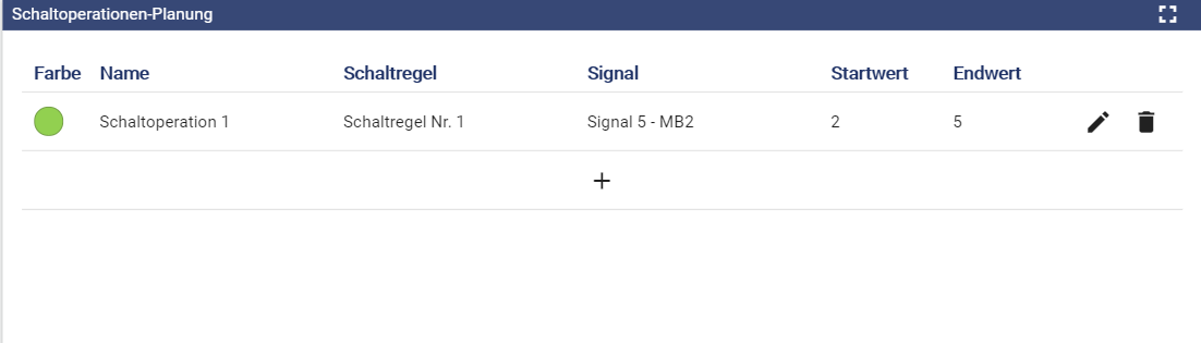 Das “Schaltoperationen-Planung”-Widget dient zur Erstellung von Schaltoperationen für einen zugehörigen Zeitschaltplan. Dieses Fenster kann auch in der Konfiguration des “Zeitschaltplan”-Widgets gefunden werden. Mithilfe dieses Widgets kann man die Schaltoperationen ganz flexibel auf dem Dashboard anpassen. Das bietet den Mehrwert, dass nicht für jede Anpassung in die Konfiguration des “Zeitschaltplan”-Widgets navigiert werden muss. Zum Erstellen einer Schaltoperation wird entweder ein analoges oder ein digitales Ausgangs-Signal benötigt.
