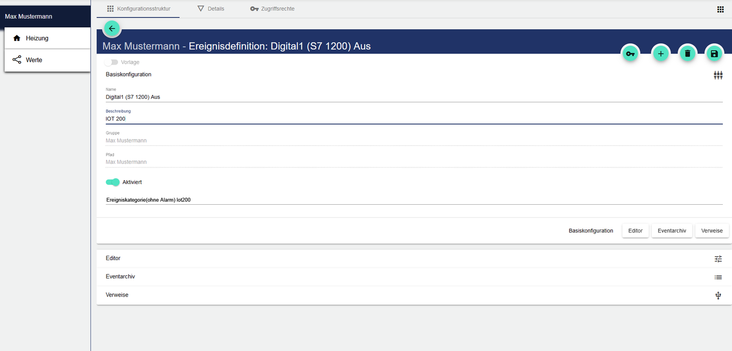 In der Basiskonfiguration legen Sie Name und Beschreibung an und wählen über den Navigator die zuvor angelegte Ereigniskategorie aus.