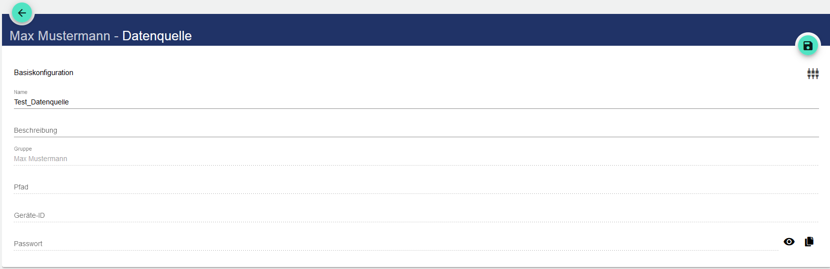Name für die Datenquelle vergeben und speichern. Die Geräte-ID und das Passwort werden automatisch systemseitig generiert.