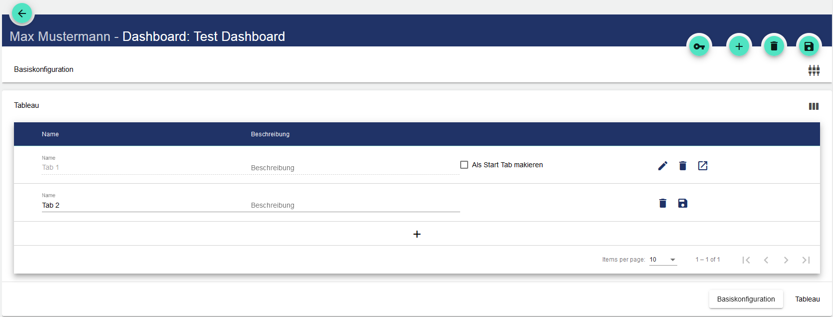 Erneut über die Konfigurationsstruktur das Dashboard auswählen und eines hinzufügen (siehe auch: Einrichtung Dashboard). In der Basiskonfiguration den Namen vergeben und über die Fläche “Tableau” beliebig viele Tabs hinzufügen → Speichern.
