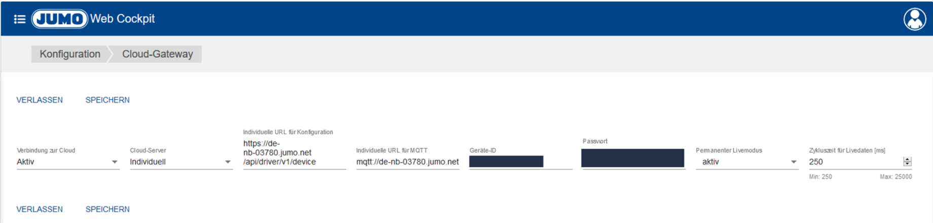Im “JUMO Web Cockpit” des variTRON Gerätes unter Konfiguration und Cloud Gateway die Geräte-ID und Passwort aus der JUMO smartWARE SCADA eintragen